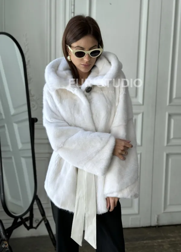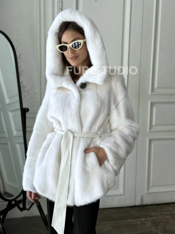 Белая шуба из меха норки (крестовка) с капюшоном 100887