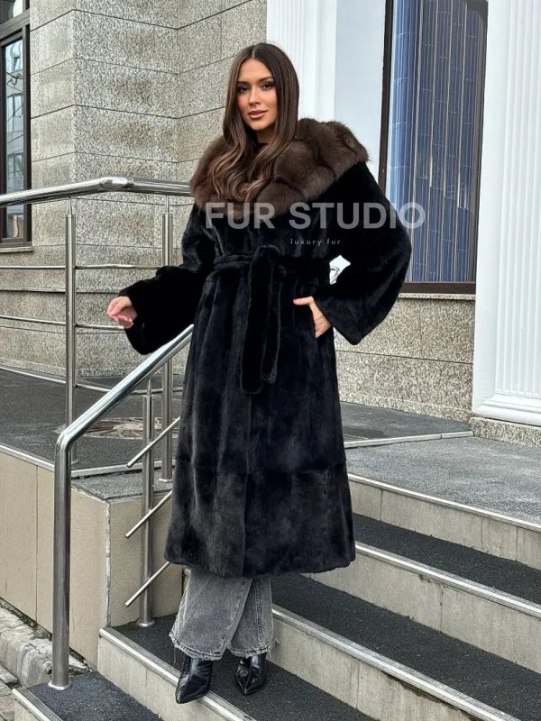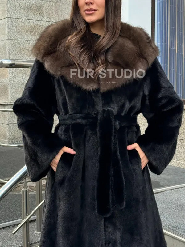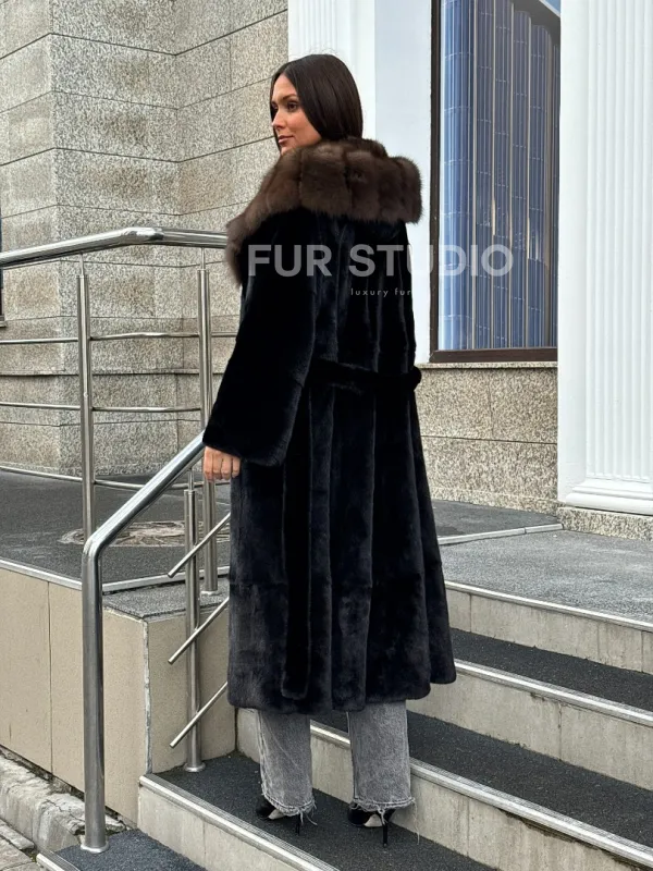 Черная норковая шуба с капюшоном куница 102520