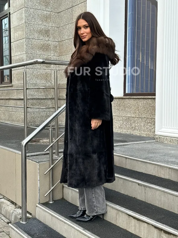 Мех данной шубы аукционная норка, цвет черный. Предлагается в размерах от 46 до 52. Длина модели 120-125 см, что выгодно подчеркивает фигуру девушек. Эта модель идеально подойдет для девушек и женщин, предпочитающих роскошные натуральные меха.