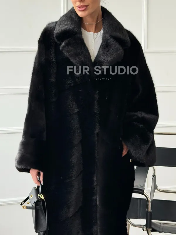 Мех данной шубы аукционная норка , цвет черный. Предлагается в размерах от 42 до 68. Длина модели 120-125 см, что выгодно подчеркивает фигуру девушек. Эта модель идеально подойдет для девушек и женщин, предпочитающих роскошные натуральные меха.
