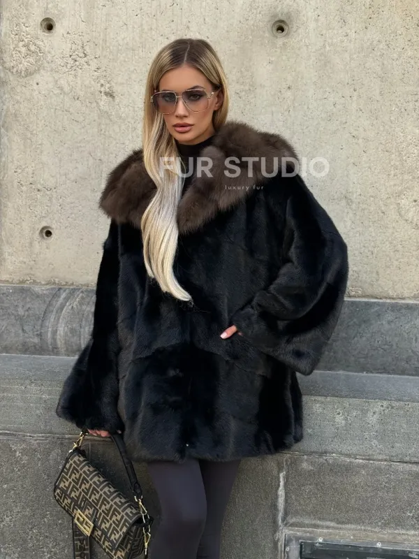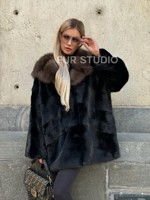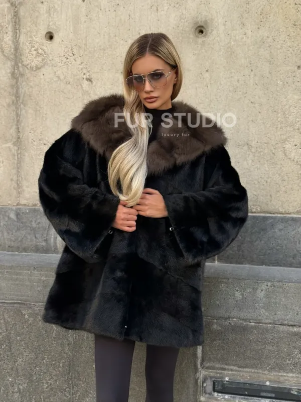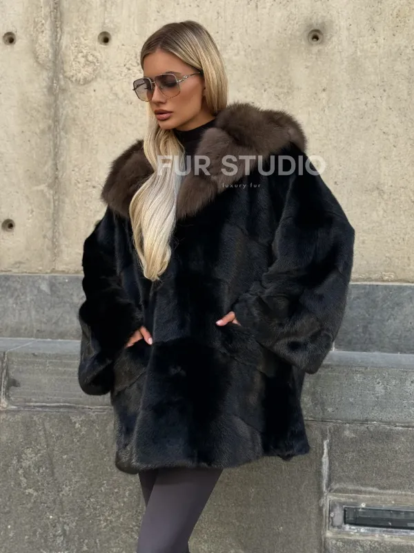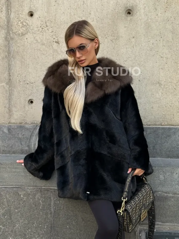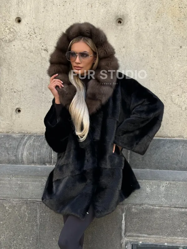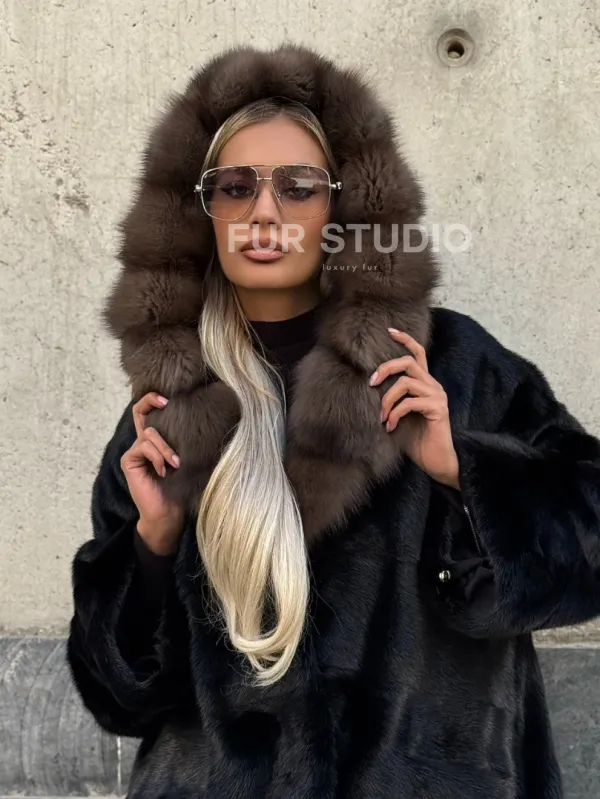 Черный норковый полушубок с капюшоном куница 102250