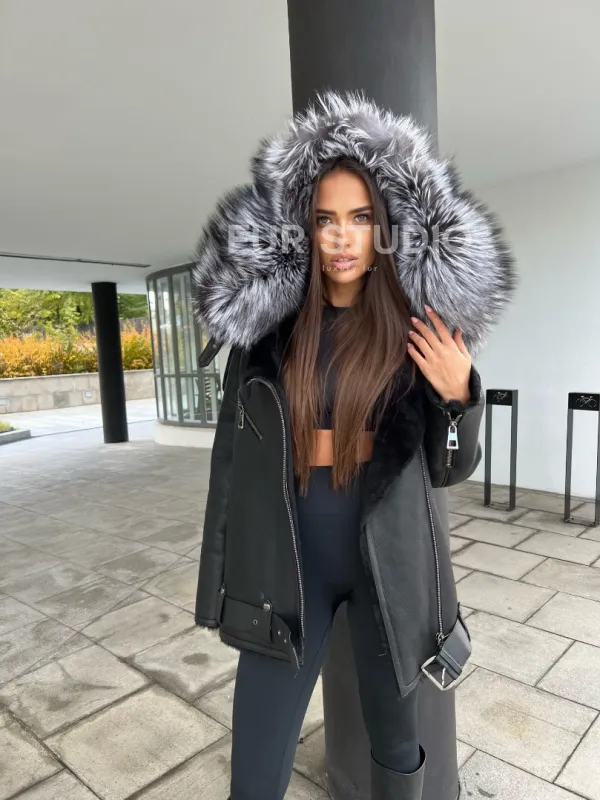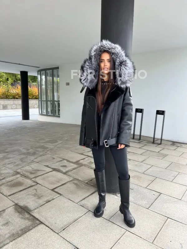 Дубленка - косуха с капюшоном из меха чернобурой лисы 100299