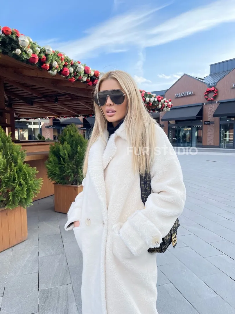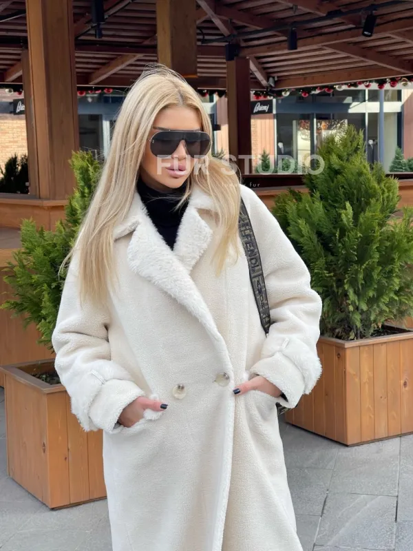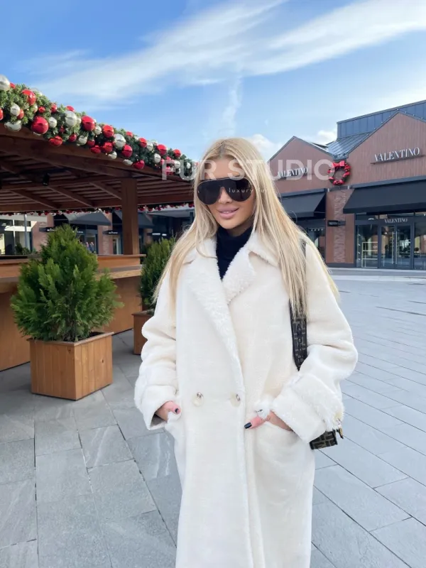 Экошуба в белом цвете с английским воротником - выбор истинных леди. Модель создаст образ снежной королевы. Экомех отличная альтернатива натуральному для тех, у кого ограничен бюджет. Оригинальный воротник подчеркнет изящную шею. Широкие манжеты акцентируют внимание на тонких кистях. Длина оптимальна и комфортна в носке.