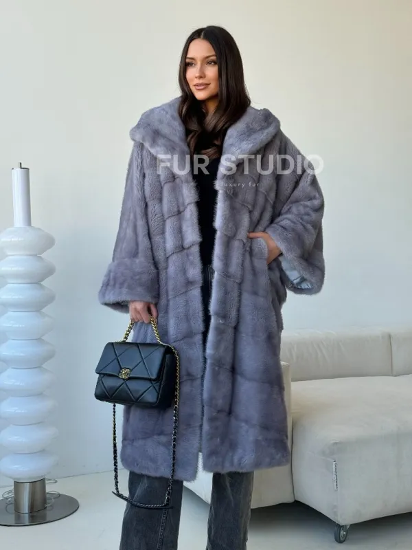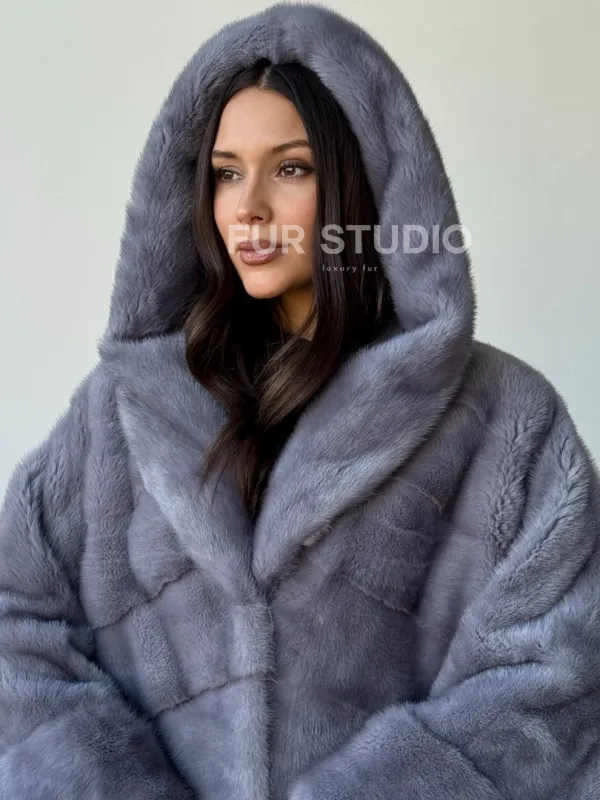 Голубая норковая шуба с капюшоном oversize 102501