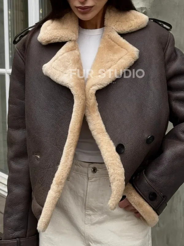 Кроп - дубленка двубортная Dark brown на пуговицах 101726
