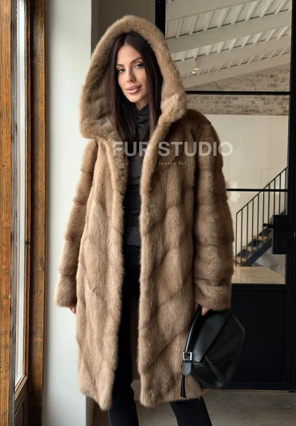 Норковая шуба с капюшоном - цвет пастель 100849