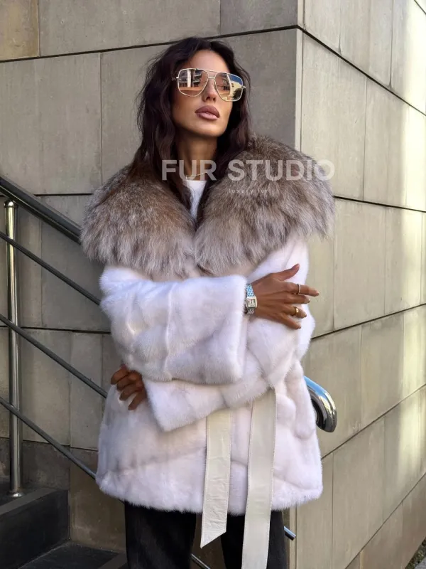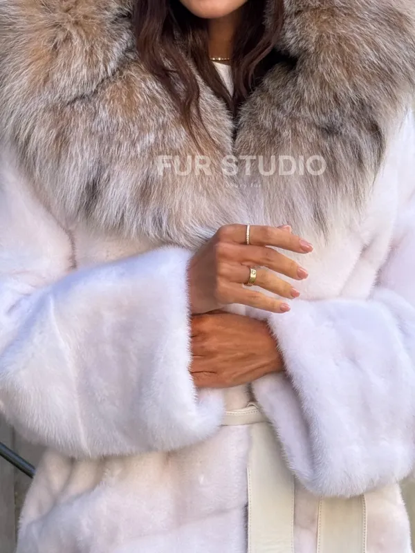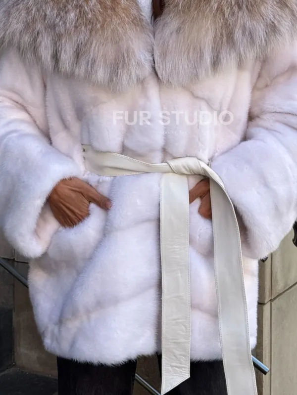 Норковая шуба с мехом рыси - белая 102107