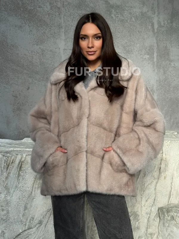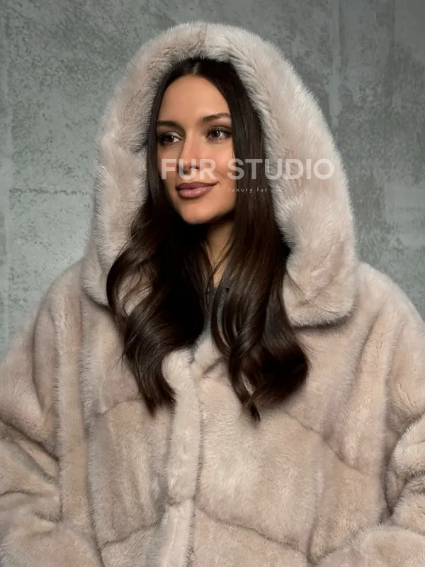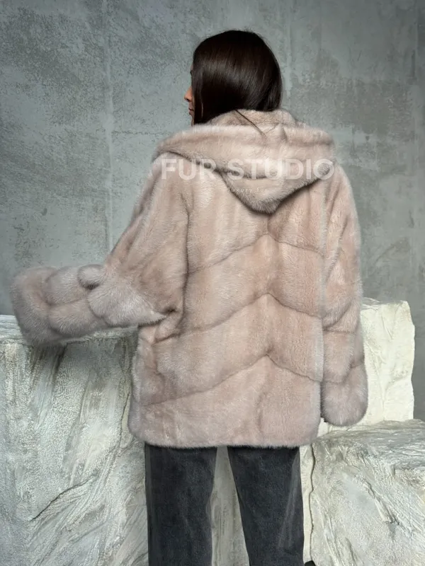 Норковый полушубок с капюшоном в цвете пудра 102512