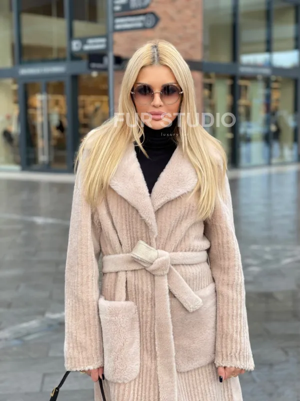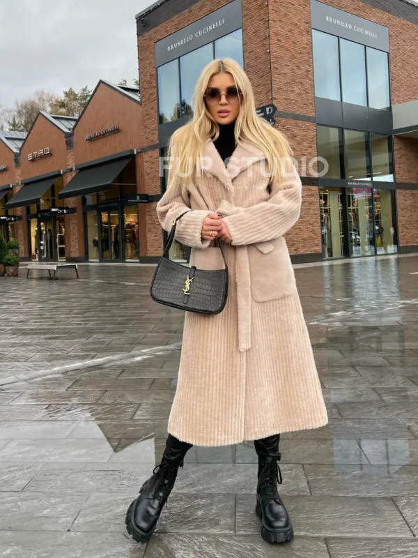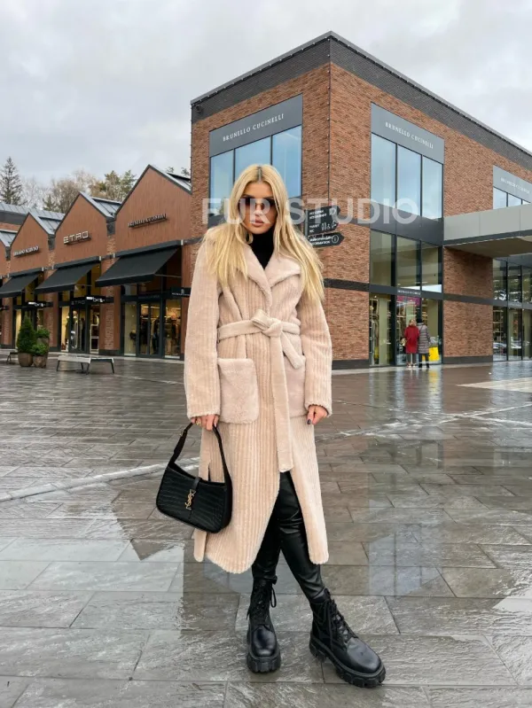 Шуба из натуральной шерсти в бежевом оттенке выбор девушек с отличным вкусом. Изделие выглядит стильно, лаконично. Натуральная шерсть позаботится о комфортной температуре тела в прохладное время года. Необычный крой зрительно удлинит силуэт и подчеркнет достоинства фигуры. Оригинальный пояс очертит талию. Глубокие карманы согреют ручки в непогоду.