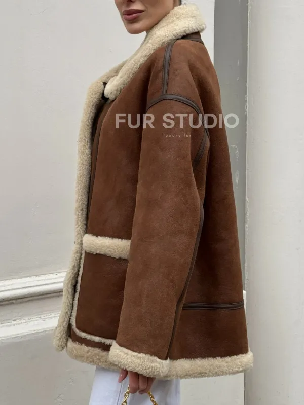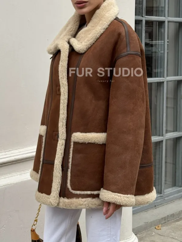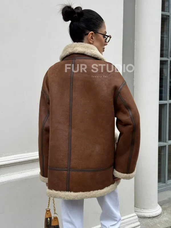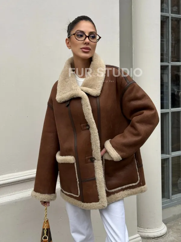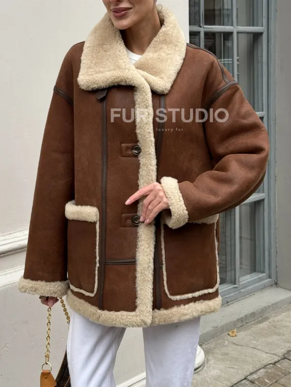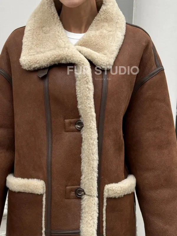 Современная коричневая дубленка из меха кёрли «Casual style» 101306