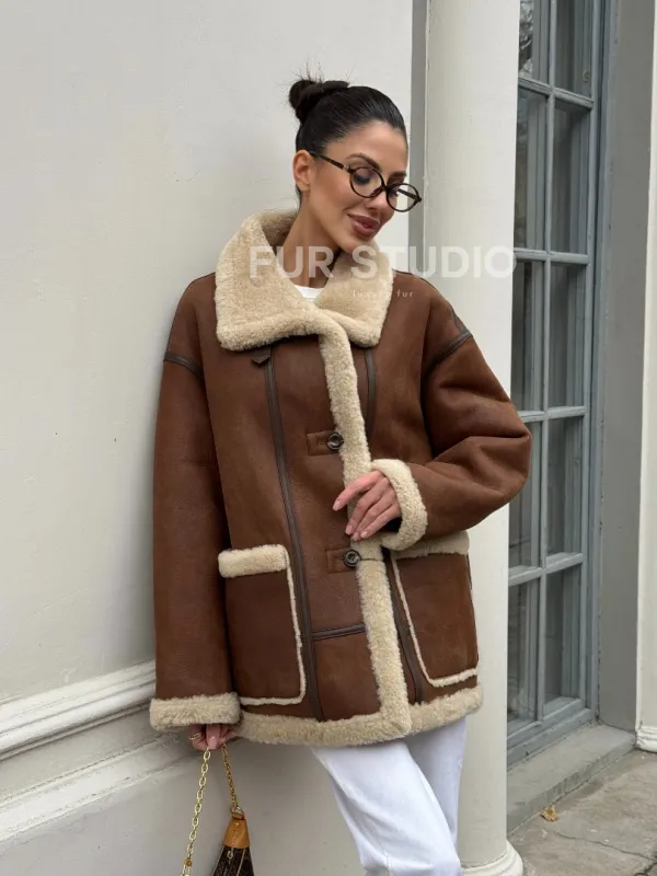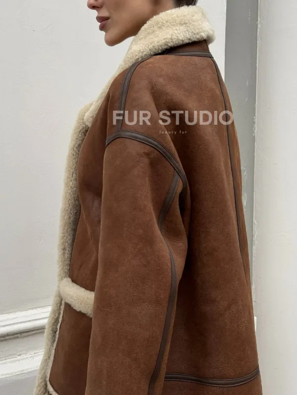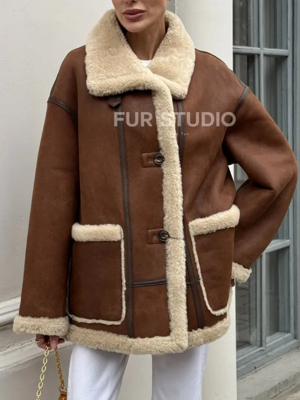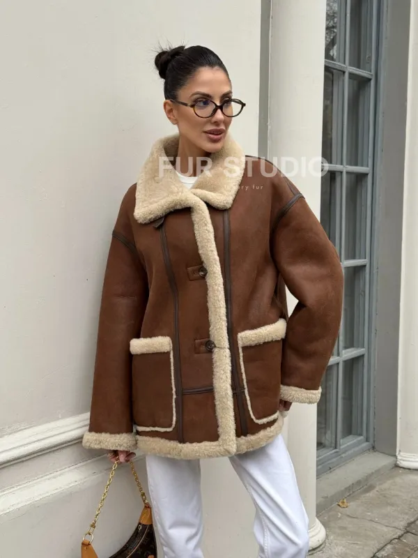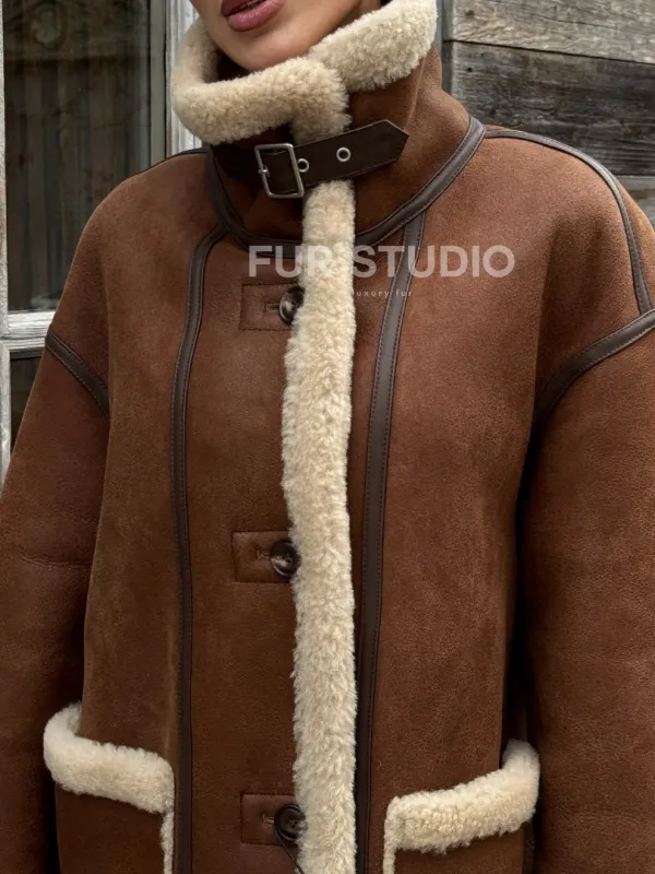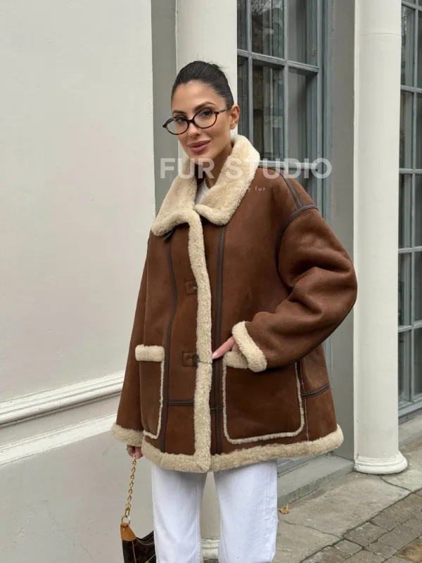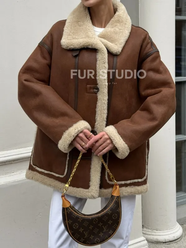 Современная коричневая дубленка из меха кёрли «Casual style» 101306