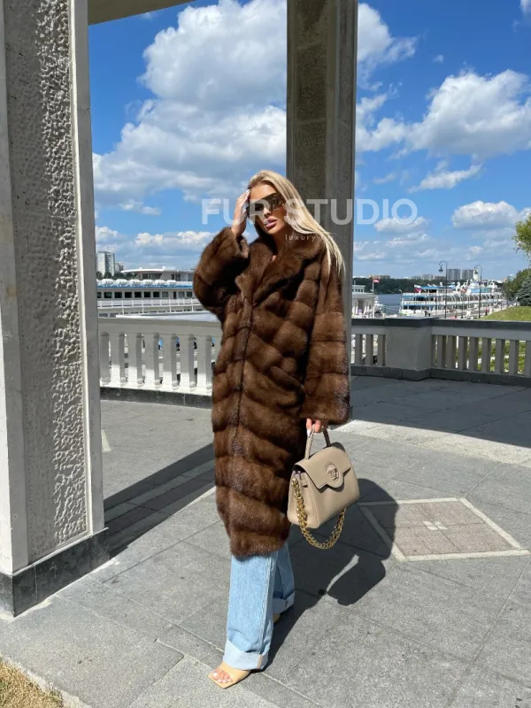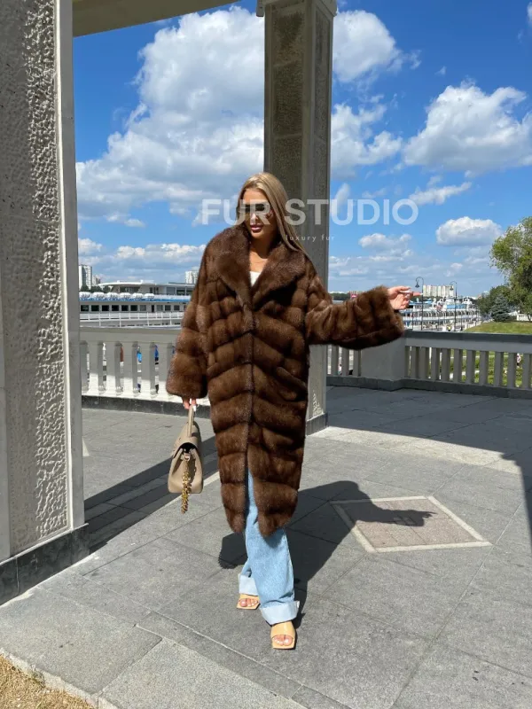 Модель гармонично сочетается с любым гардеробом от базового до вечерних туалетов. Длина изделия позволяет носить короткие вещи, что очень удобно в холодное время года. Прямой крой зрительно увеличит рост и скроет недостатки фигуры. Широкие рукава подчеркнут изящество кистей и не сковывают движение рук. Добавьте в образ статусную сумочку, и вы будете выглядеть дорого и изысканно. Купить удлиненную норковую шубу в цвете соболь могут женщины, которые знают толк в моде.