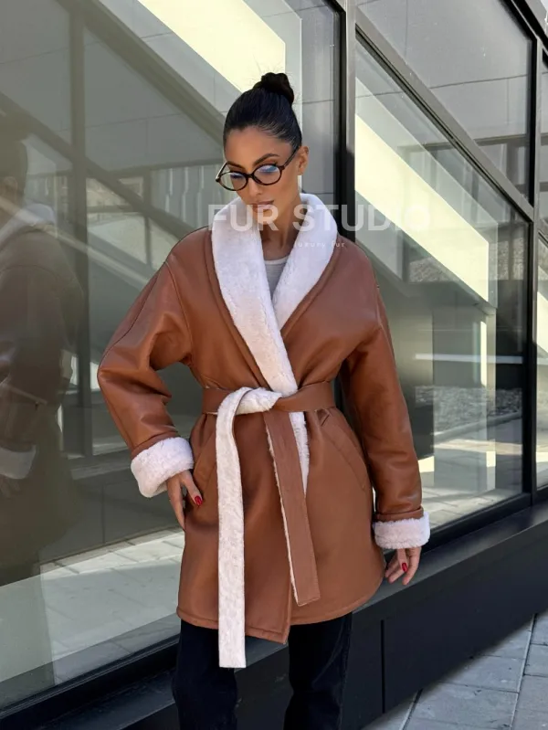 Женская дублёнка на запах с поясом - цвет кэмел 101160